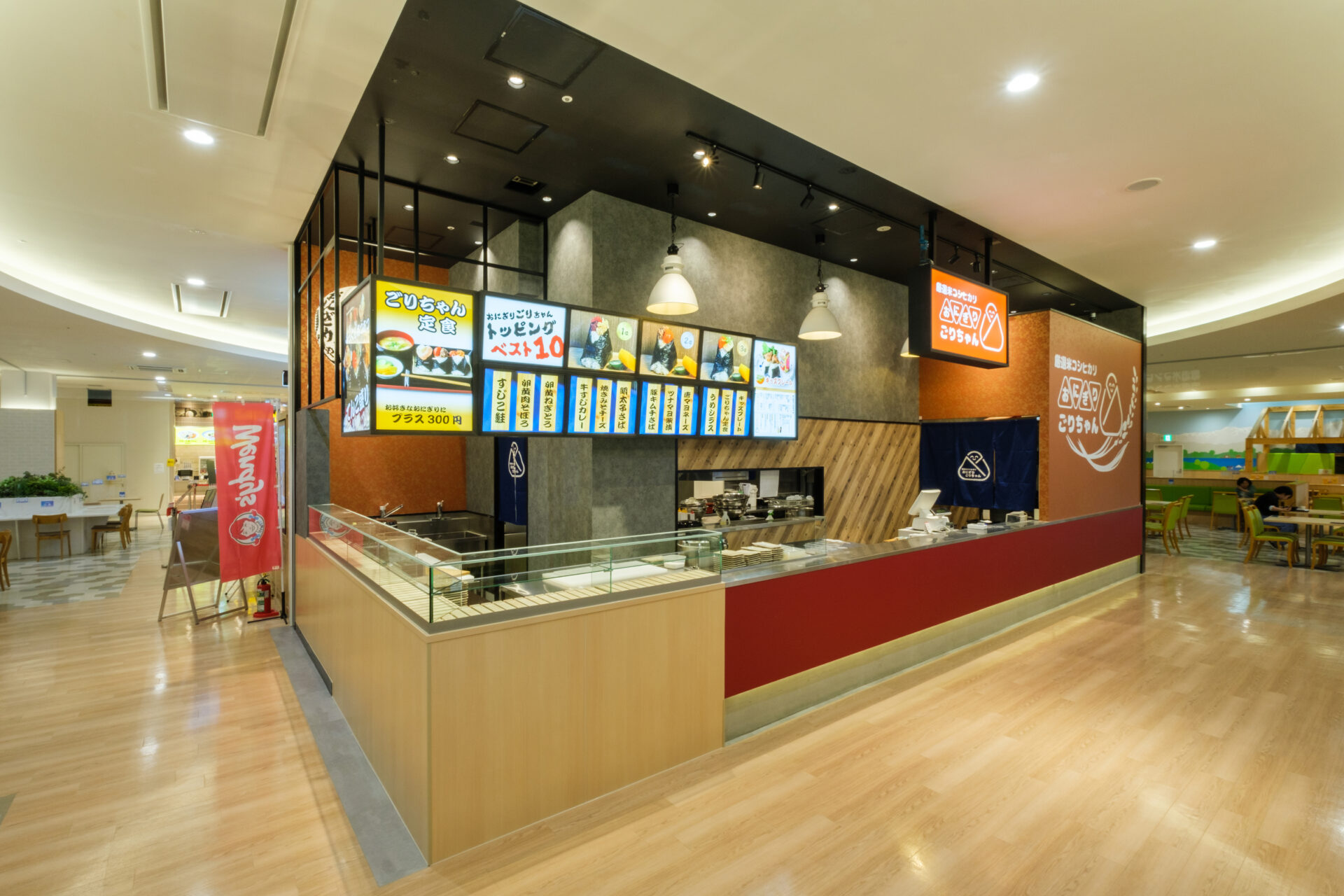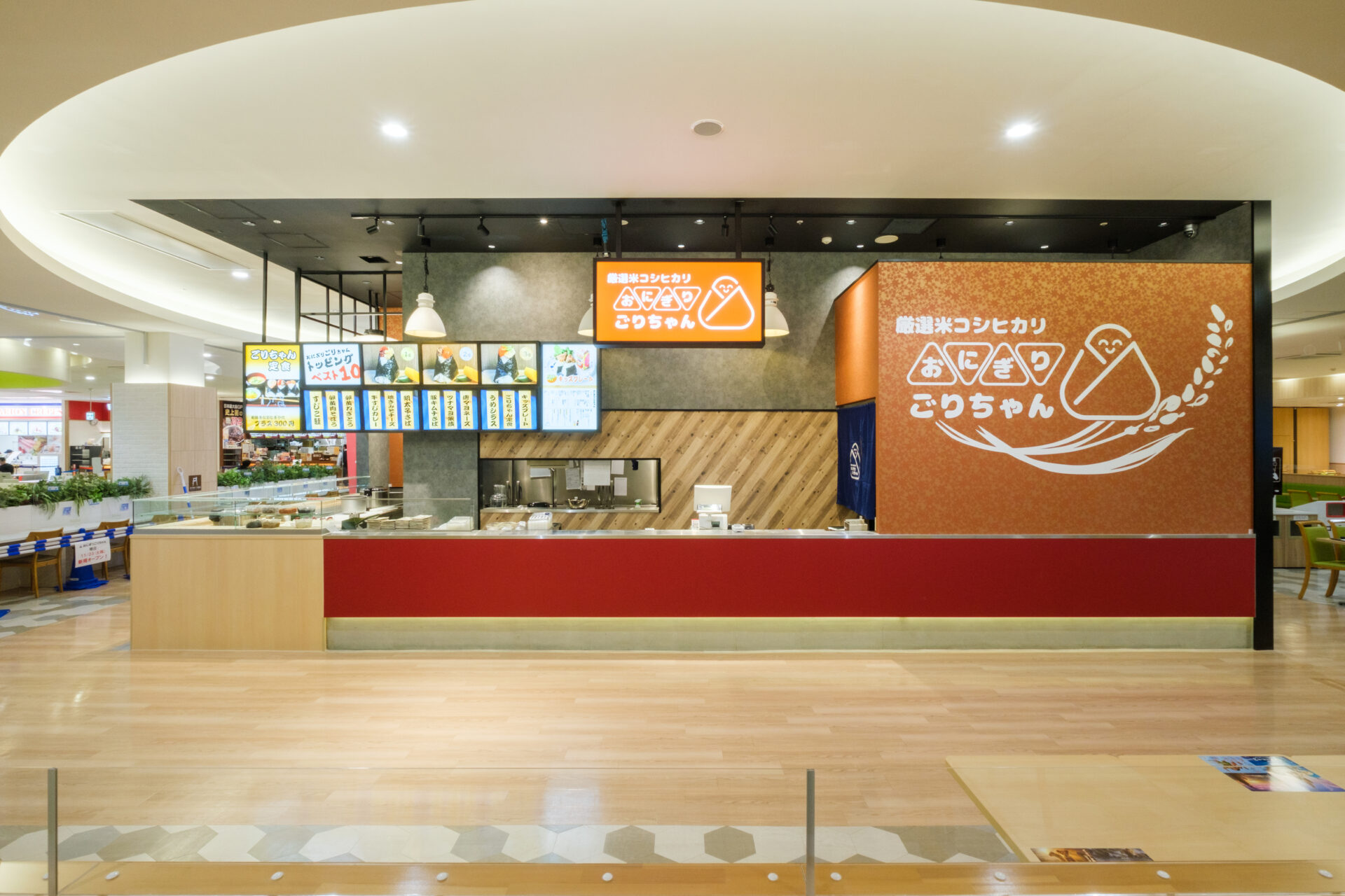case お客様の声 飲食店 おにぎりごりちゃん 富山ファボーレ店 リーシングデザイン設計施工 大阪で大人気!【おにぎりごりちゃん】が北陸に初上陸! 一目で「おにぎり」とわかる親しみやすいロゴをと木目調の温かみある素材を中心に構成。 ガラス素材のショーケースに並ぶ自慢の具材を、行列に並ぶ間にも視覚的に楽しめるように設計しました。 握りたてのおにぎりを楽しめるライブ感を重視し、来店者が調理の過程を楽しめる仕掛けが施されています。