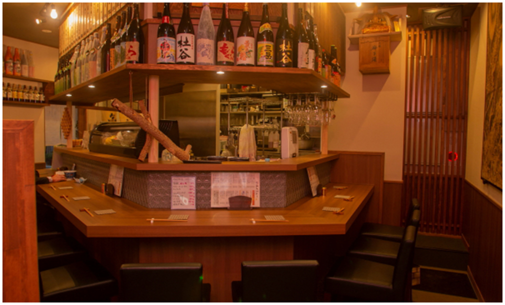 炉端割烹という大衆向けの業態でありながら、インテリアや設えに造詣が深いオーナーが、趣味で買いためていた飾り障子や和傘などをインテリアとして配置することで、清潔感のある、どこか懐かしい雰囲気が漂う空間に仕上がりました。